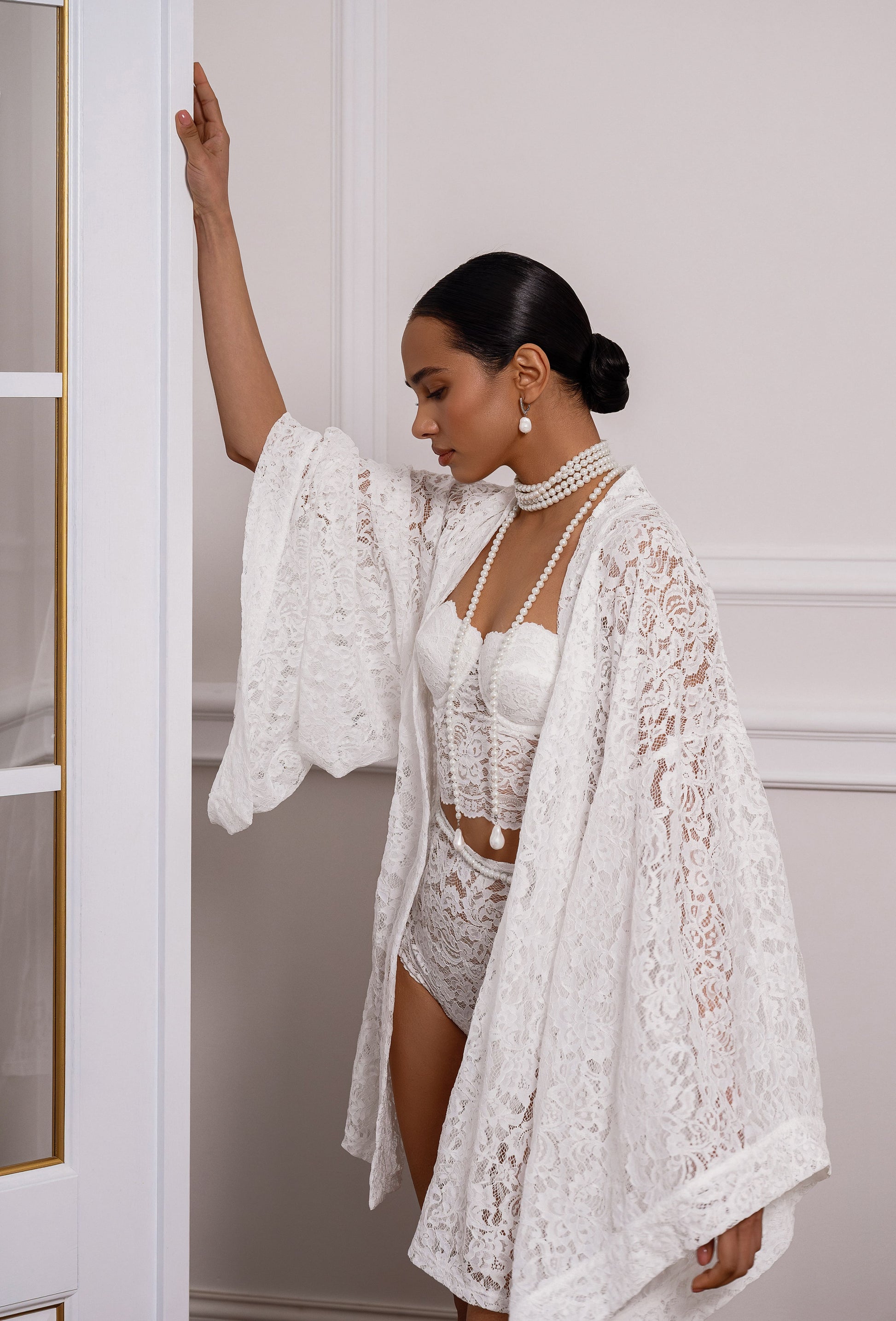 Crafted from delicate ivory lace, this bridal getting ready robe features a clean, kimono-inspired silhouette elevated by a bold, oversized floral pattern. The wide sleeves create a sense of effortless movement, while the soft structure allows the lace to drape beautifully over the body.