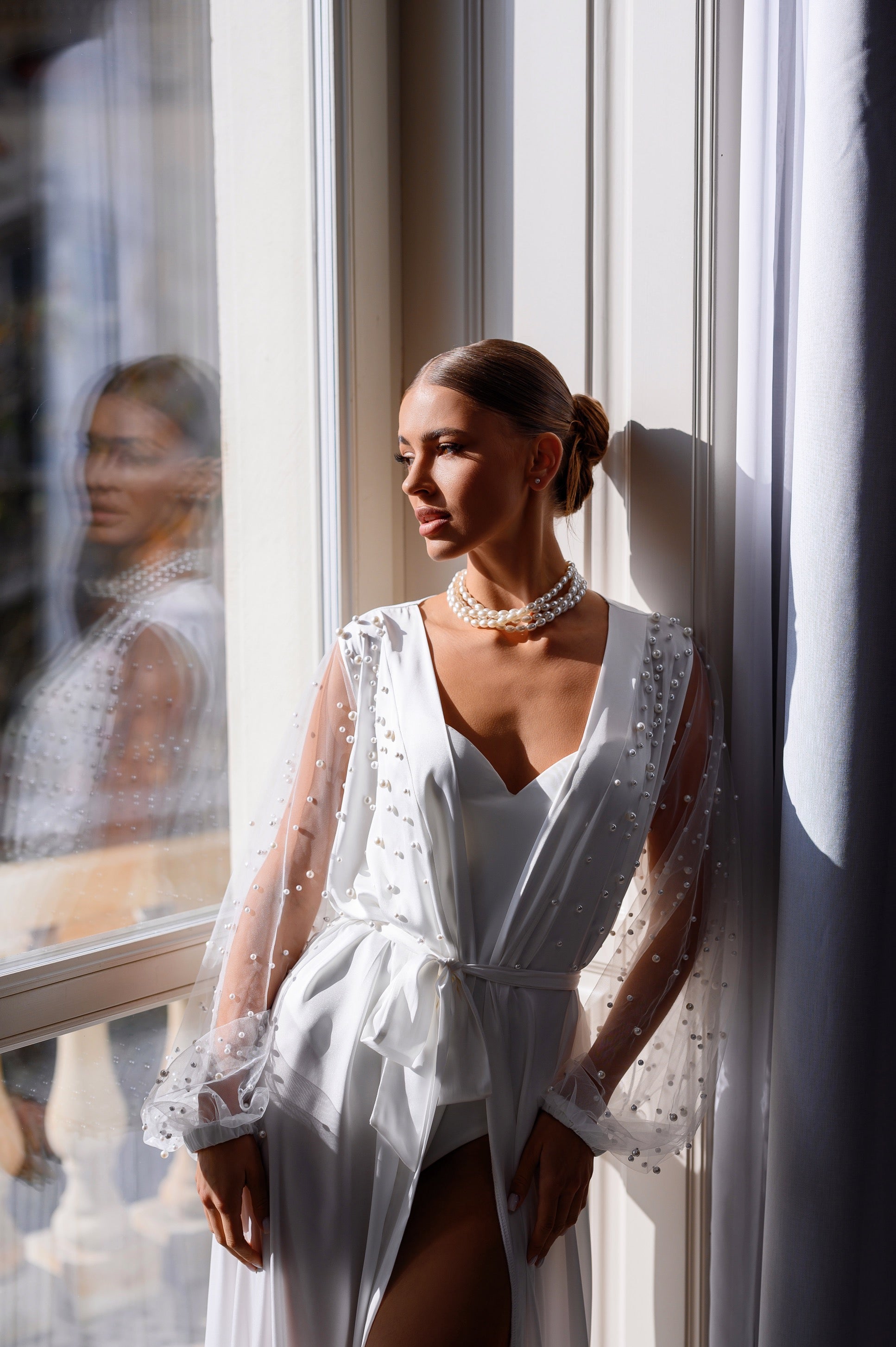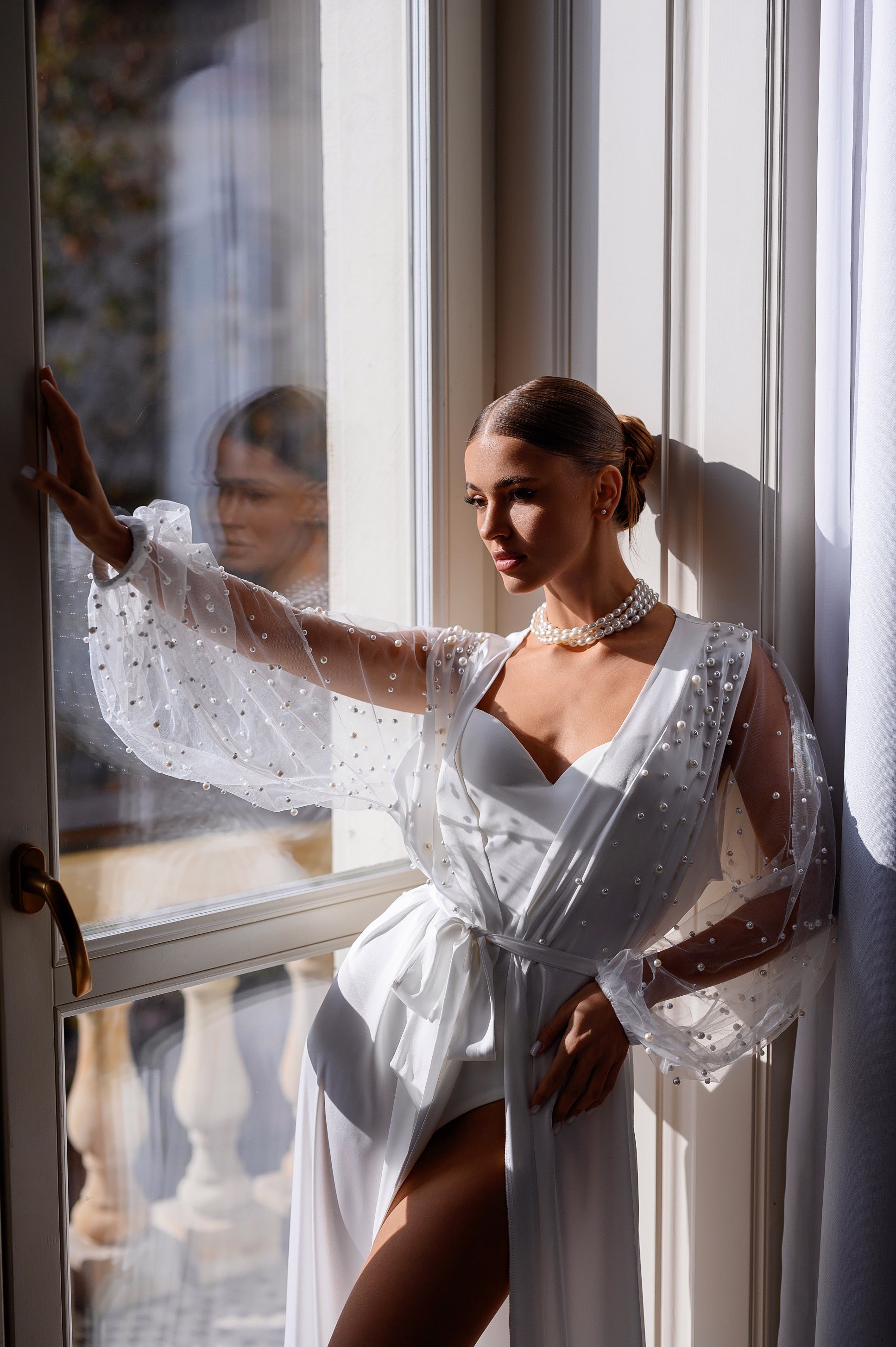 The Jane silk bridal robe features delicate tulle sleeves with individually hand-pressed pearl detailing, complemented by pearl-adorned chest panels for an elegant bridal finish.